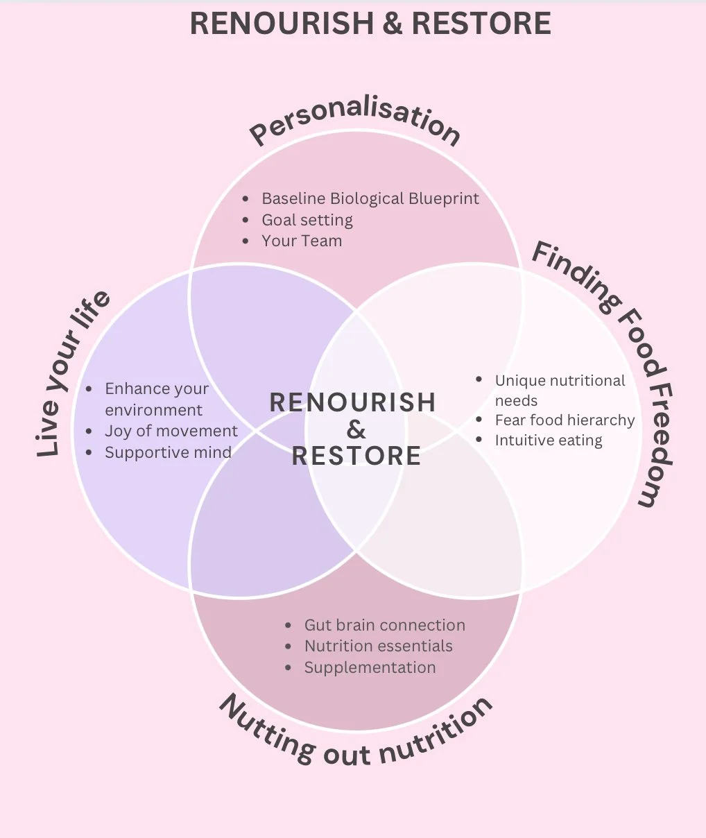 RENOURISH & RESTORE has an action-based foundation to equip you with the support and personalised guidance you need to nourish yourself with balance, compassion and joy.
